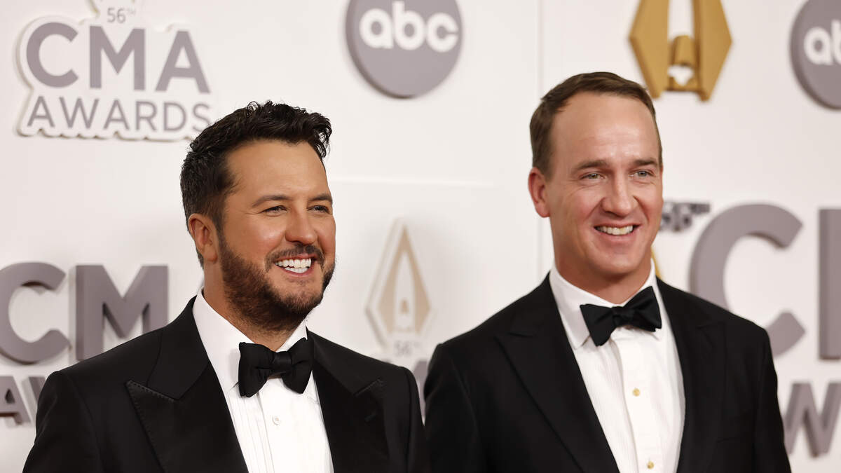 A promotional video for the 57th annual CMA Awards shows hosts Luke Bryan and Peyton Manning riding off into the sunset together.