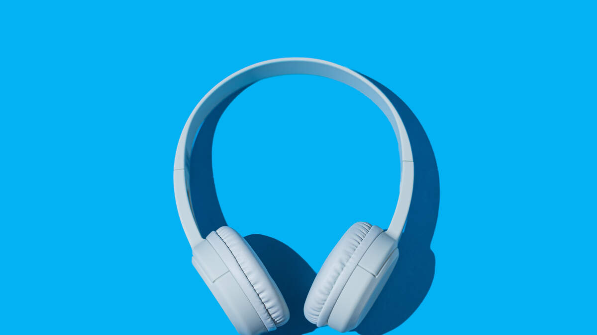 Light green wireless headphones with hard shadow on blue background. Concept of music, headphones, radio, podcast, listening and relaxing activity.